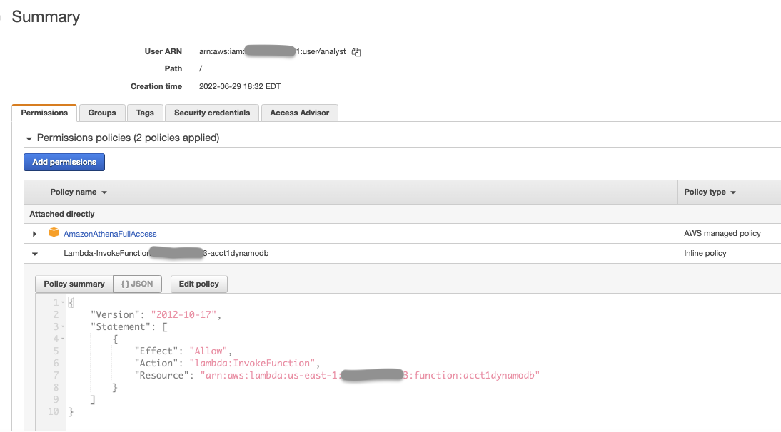 - Grant permission to the IAM user analyst to invoke the Lambda function
