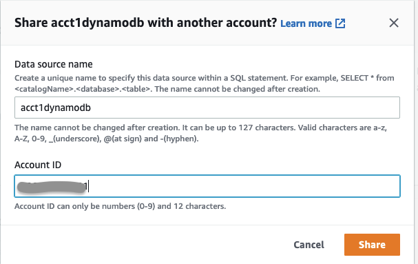 - For Account ID, enter the Account-B-id to share your data source with Account-B and click Share.