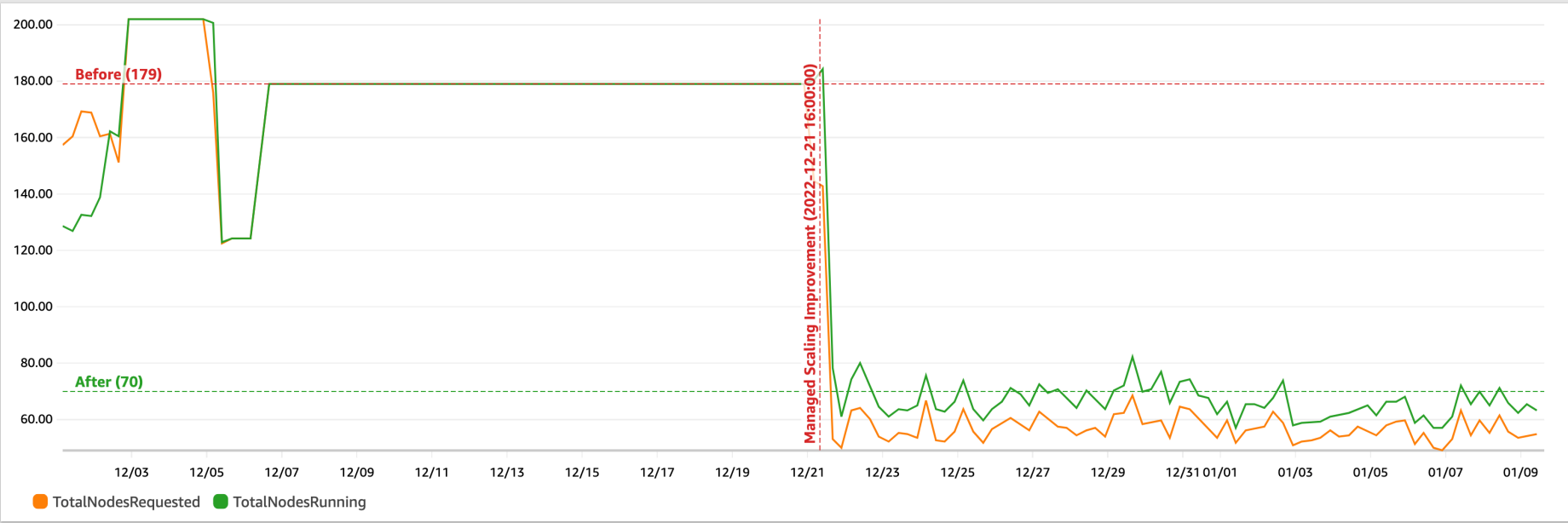 To illustrate the cost savings by examples, we looked at an EMR clusters for a technology enterprise, which heavily uses Amazon EMR to process real time billing data between Kafka and S3 using Spark. They run a persistent EMR cluster with EMR version 5.35 and have EMR Managed Scaling turned-on. The following Amazon CloudWatch dashboard shows how starting December 21, the enhanced Managed Scaling algorithm provisioned (total nodes requested) only 70 nodes vs. the previous Managed Scaling algorithm which provisioned 179 nodes for a similar job profile. The lower the number of resources provisioned to run your jobs, the lower the total cost of your EMR cluster.