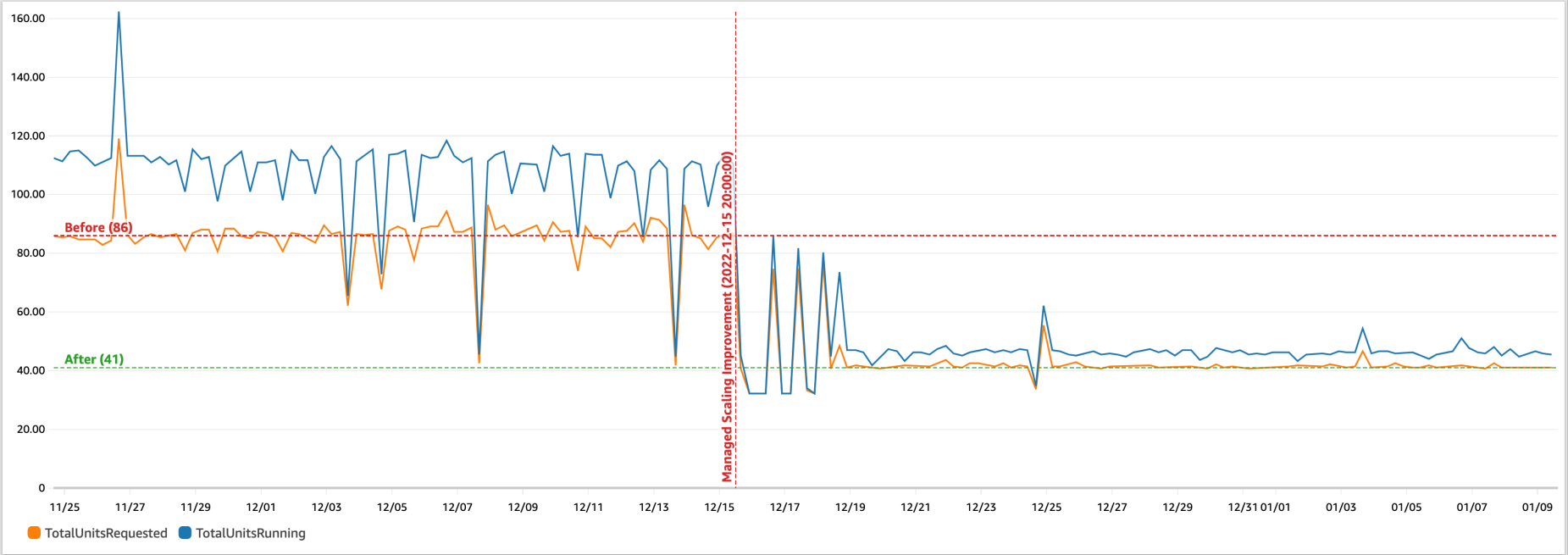 We also looked at an EMR cluster for an advertising enterprise, which leverages Amazon EMR for their data analytics strategy and executes their batch ETL jobs using Spark. They run their clusters on EMR version 6.5 and have EMR Managed Scaling turned-on. The following Amazon CloudWatch dashboard shows how starting December 15, the enhanced Managed Scaling algorithm provisioned (total units requested) only 41 nodes vs. the previous Managed Scaling algorithm which provisioned 86 nodes for a similar job profile.