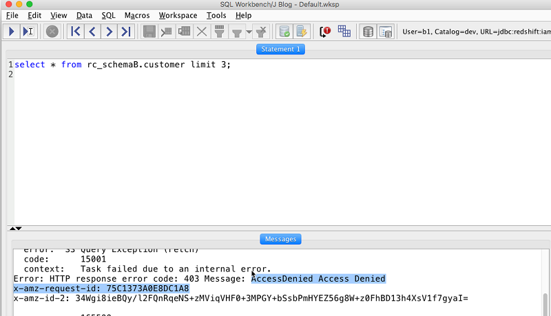 schemaAas userb1ingrpB.The following screenshot shows the error message you receive.
