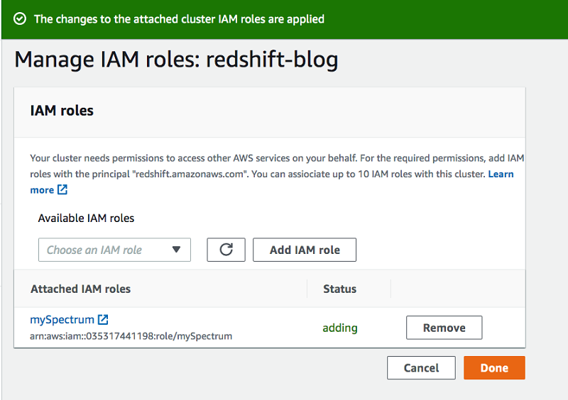 grpBto only allow them to assume this role (choose the tab Trust relationships and edit it to add the following policy updating the relevant account details):This trust relationship has to be updated for each user for this role, or build a role for each user. It is fairly easy to script automate updating this trust relationship. - Attach the three roles to the Amazon Redshift cluster and remove any other roles mapped to the cluster. If you don’t find any roles in the drop-down menu, use the role ARN.