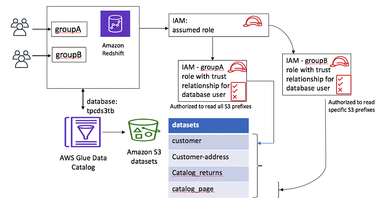 Redshift-customizablerole specific togrpBwith a policy restricting access only to Amazon S3 locations where this group is allowed access.