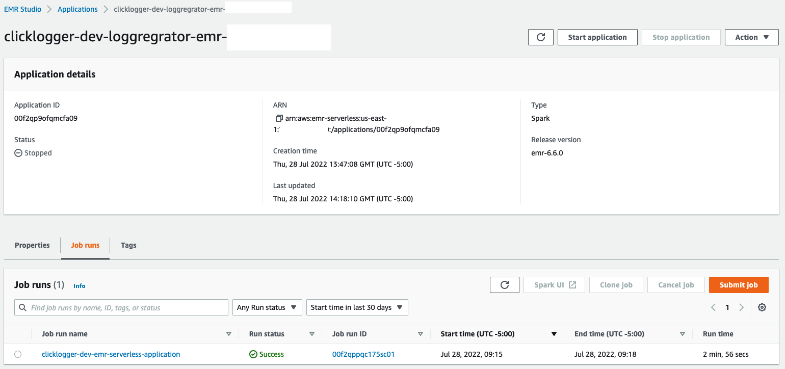 - The EMR Serverless application provides the option to submit a Spark job.