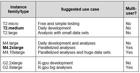 The M4 instance family is often a good choice for R workloads. If you use R packages such as foreach, parallel, or snow to parallelize, we recommend using the bigger M4 instance types. They provide a good mix of CPU power and memory.