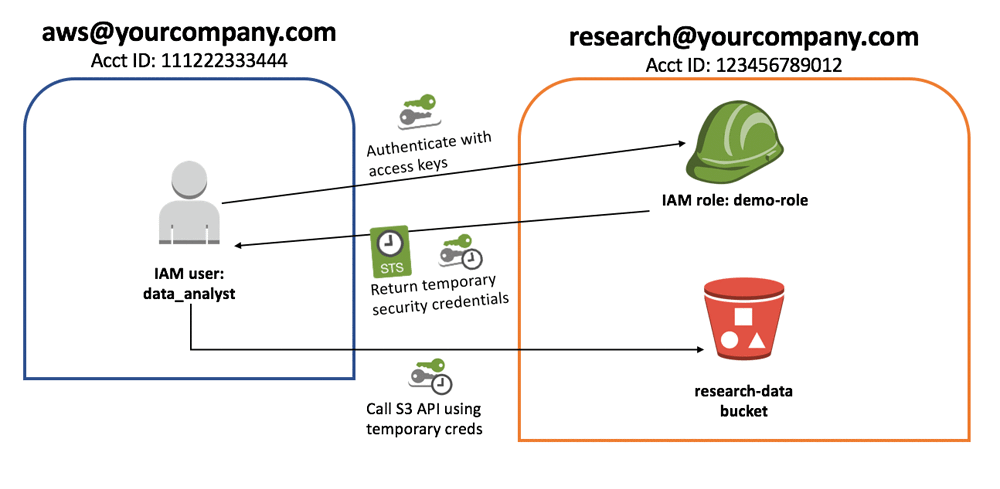 Also, you have an IAM user called “data_analyst” in aws@yourcompany.com. This user should be granted cross-account access to read data from the bucket called “research-data” in research@mycompany.com. In order to enable cross-account access, follow these procedures: