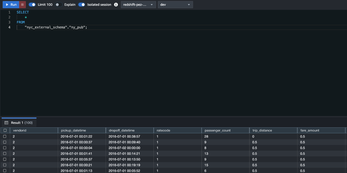 - Once connected as a federated user, run the following SQL commands to query the ny_pub data lake table: