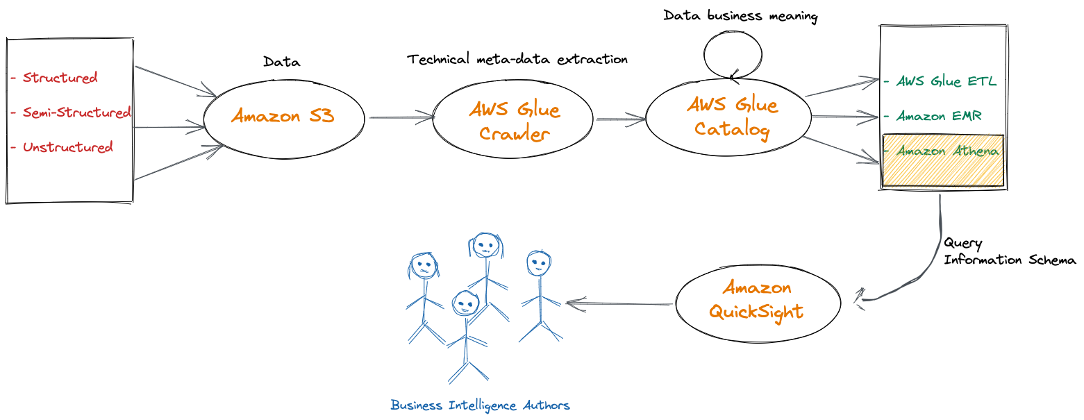 BI authors can use text search instead of SQL to search for data meanings of data stored in an S3 data lake. This can be done by setting up a visual layer on top of Athena inside QuickSight.