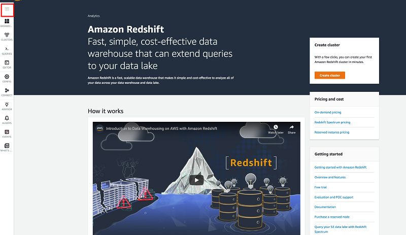 When you log in to the new console and you don’t have a cluster, you see the launch page. You can navigate to your dashboard, clusters, queries, Query Editor, configuration changes, and advisor using the left navigation menu.