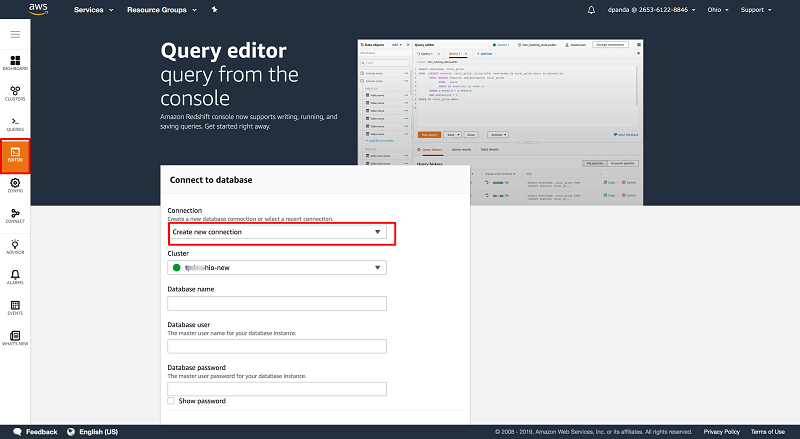 The Query Editor allows you to author and execute queries in your cluster. To connect to your cluster, from Editor, choose Connect to database.