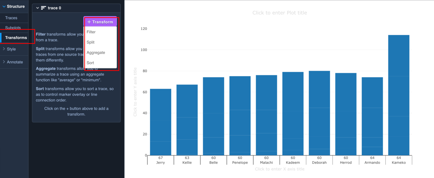 For certain chart types, you can add transforms to filter, spilt, aggregate, and sort the underlying data for the chart.