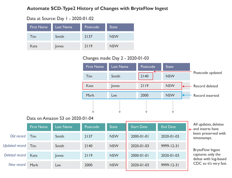 CDC is an important element of syncing data with Amazon Redshift. BryteFlow automatically merges changes on Amazon Redshift, with type2 history (if configured) with high performance. This means that data is ready to use as soon as it is ingested, without running lengthy ETL processes on it. The following diagram illustrates the type2 history feature.