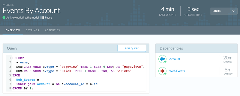 Etleap supports creating and managing such pre-computations through a feature called models. A model consists of a SELECT query and triggers for when it should be updated. An example of a trigger is a change to a base table, that is, a table the SELECT statement uses that defines the model. This way, the model can remain consistent with its base tables.