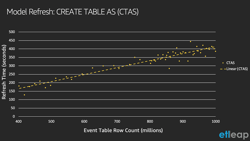 AXS manages a large number of Etleap models. For one particular model, the CTAS query takes over 6 minutes, on average. This query performs an aggregation on a join of three different tables, including an event table that is constantly ingesting new data and contains over a billion rows. The following graph shows that the CTAS query time increases as the event table increases in number of rows.