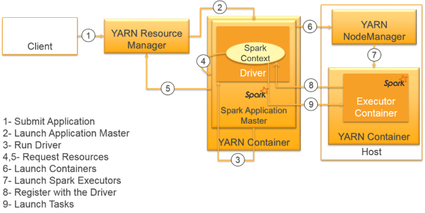When running in cluster mode, the driver runs on ApplicationMaster, the component that submits YARN container requests to the YARN ResourceManager according to the resources needed by the application. A simplified and high-level diagram of the application submission process is shown below.