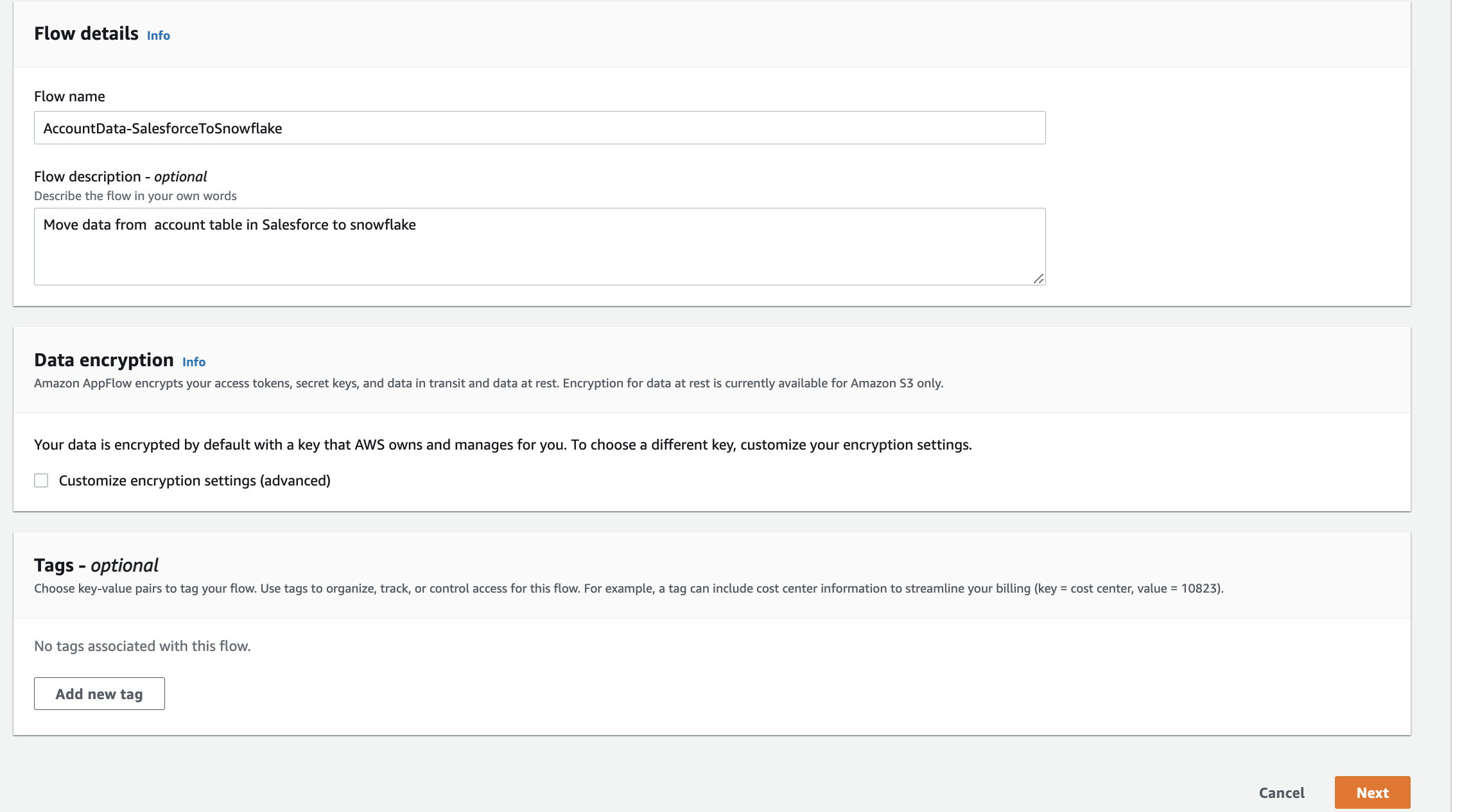 AccountData-SalesforceToSnowflake). - Optionally, provide a description for the flow and tags.