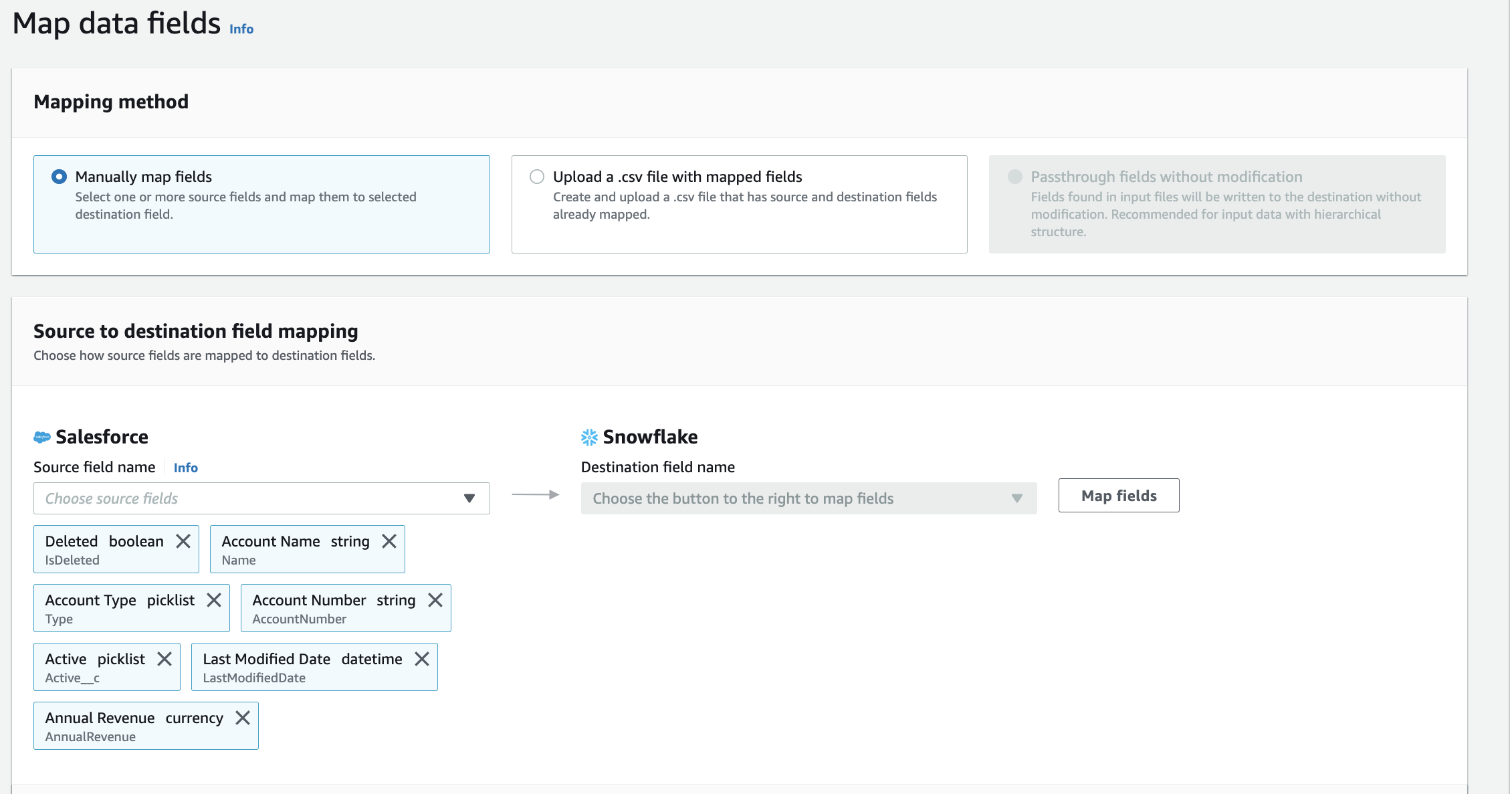 - Select Manually map fields to map the fields between your source and destination.