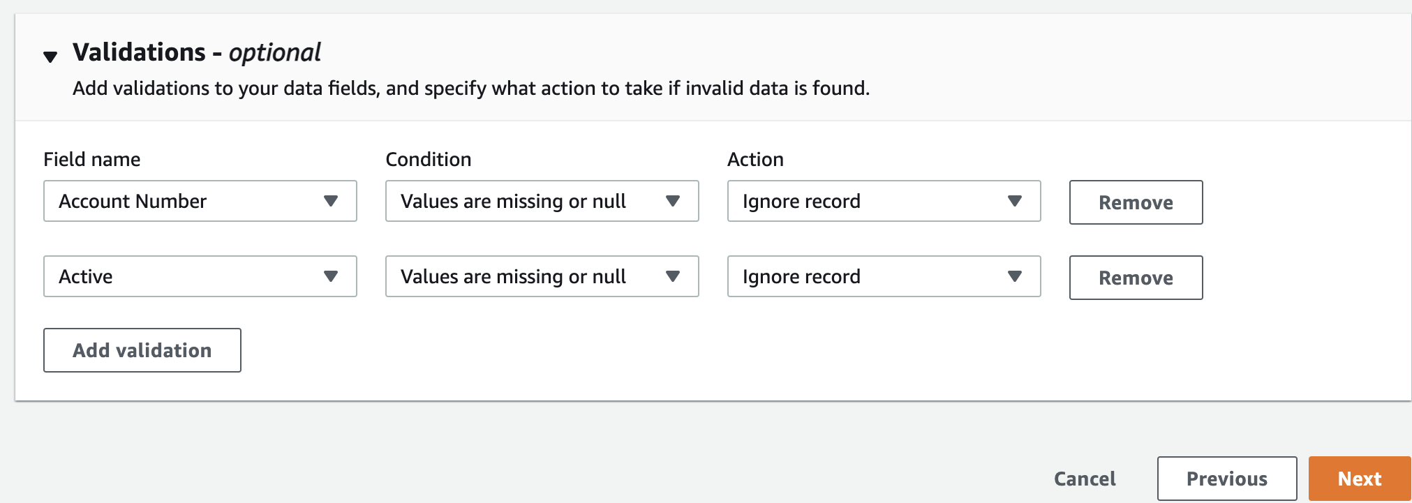 - Choose Add Validation to configure validations for these fields.