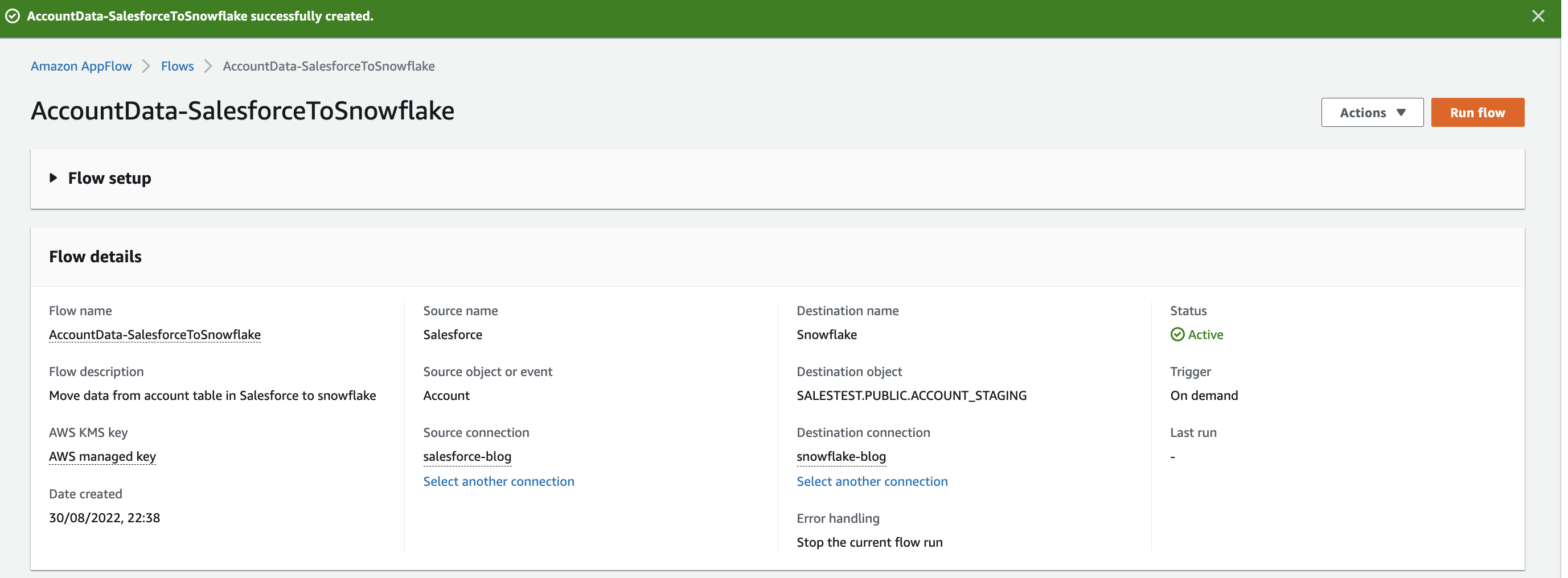 - On-demand – You can manually run the flow through the AWS Management Console, API, or SDK call.