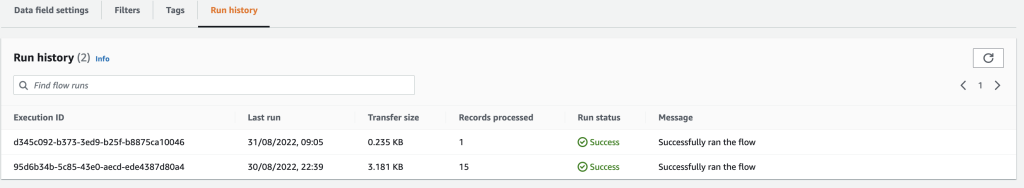You can see the details of the run, including number of records transferred, on the Run History tab of your flow.