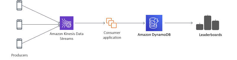 The following diagram shows a streaming data pipeline connected to a multiplayer video game. Kinesis Data Streams ingest player scores and other stats. You can filter and enrich the data, and write it to DynamoDB tables that populate the game’s various leaderboards.