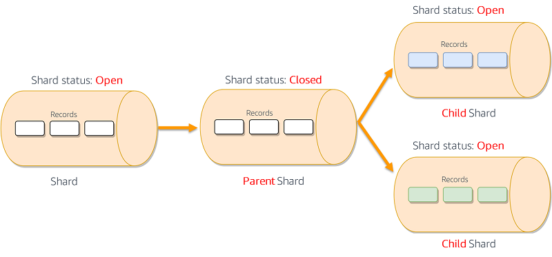 SplitShard facilitates that process. The hash key space of the parent shard also splits. The two new shards accept new data records and the parent shard stops accepting new records. Existing records in the parent shard are retained for the duration of the stream retention period (the default is 24 hours, configurable up to 7 days). You must specify the new-starting-hash-key value when issuing this command. This value determines the point of the split within the parent shard’s hash key space. In most cases, you want to do an even split. However, you might need to do an uneven split if you have unbalanced shards that you want to rebalance, for example. The following diagram shows the SplitShard process in action.