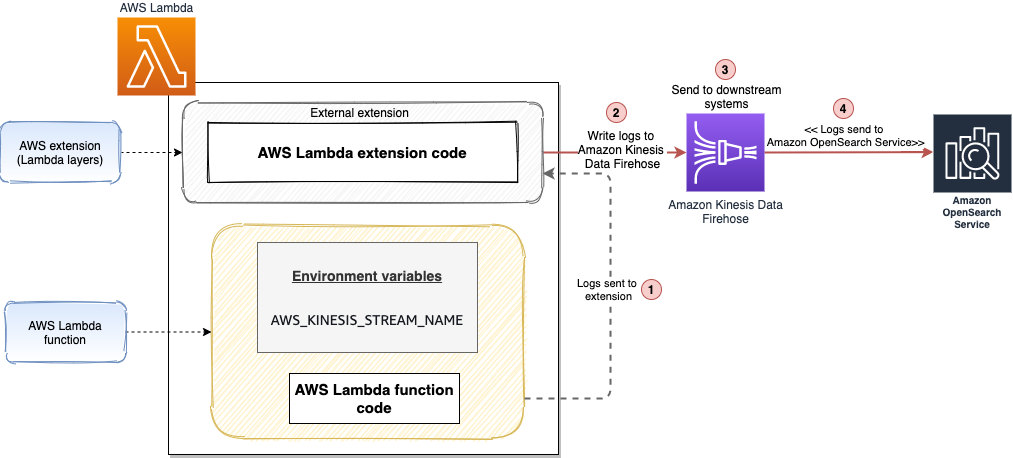 - The extension buffers the log events in a synchronized queue and writes them to Kinesis Data Firehose via PUT records.