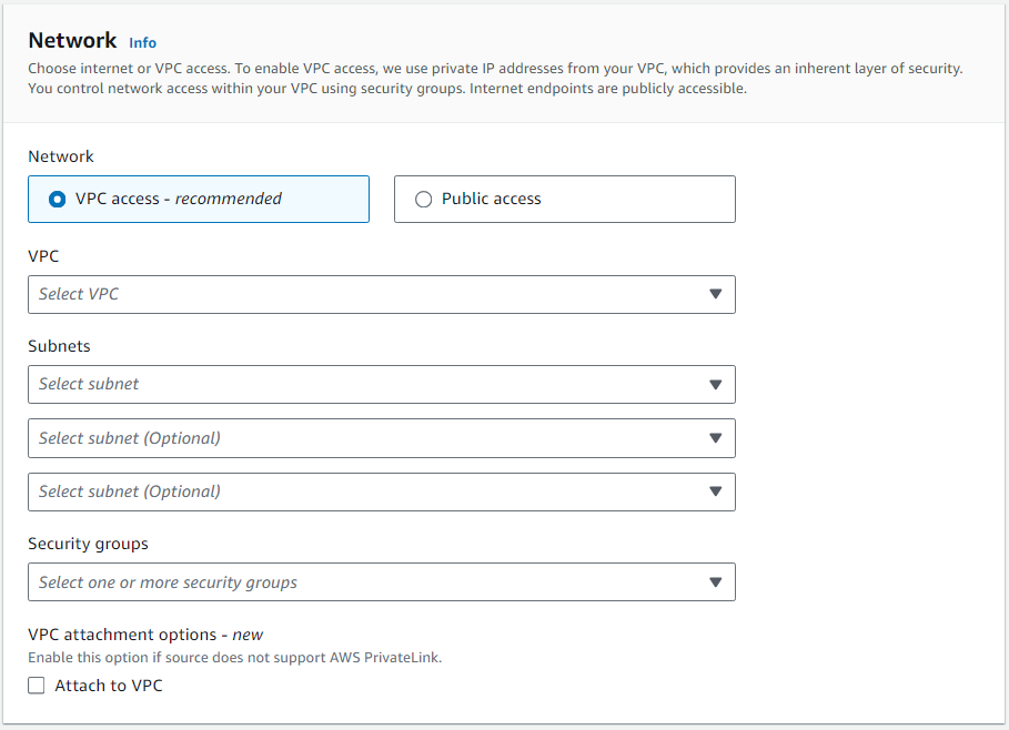 - In the Network section, select VPC access.