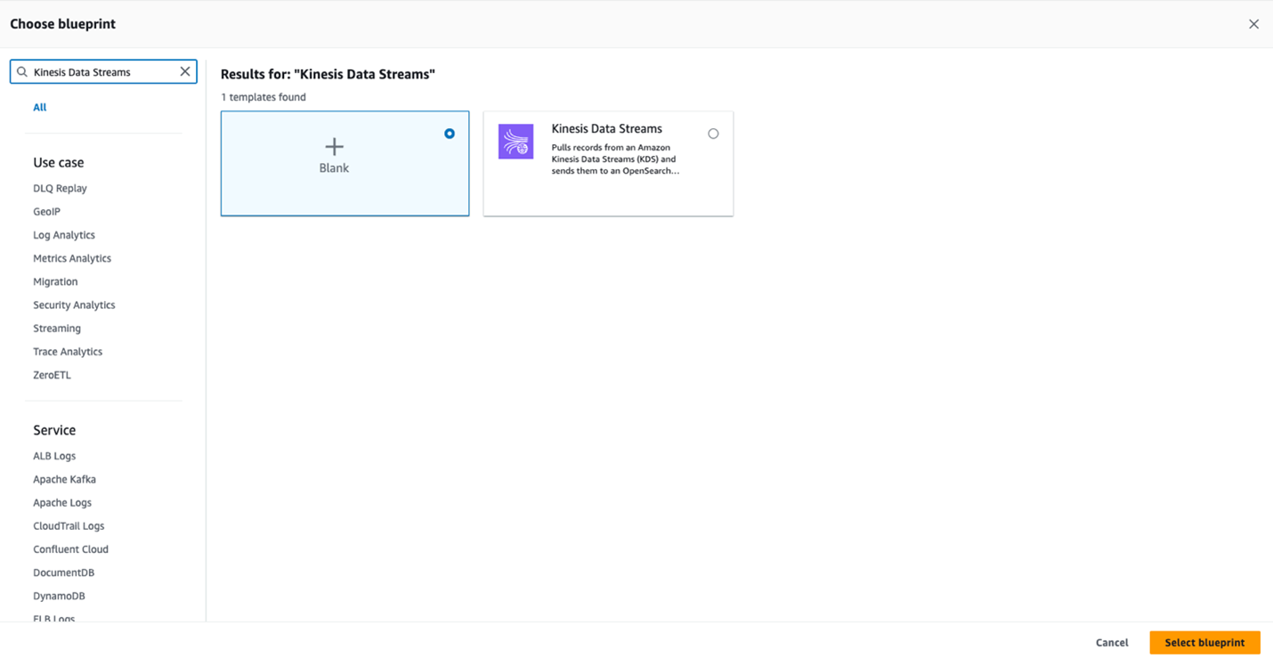 - Search for Kinesis in the blueprints, select the Kinesis Data Streams blueprint, and choose Select blueprint.