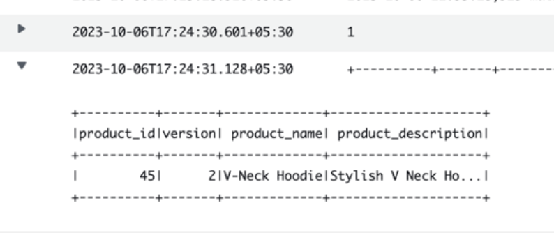 The AWS Glue job extracted all records from the source table product. It keeps track of the last combination of values in the columnsproduct_idandversion.Next, we run another Lambda function to insert a new record. Theproduct_id45 already exists, but the inserted record will have a new version as 2, making the combination sequentially increasing. - Run the