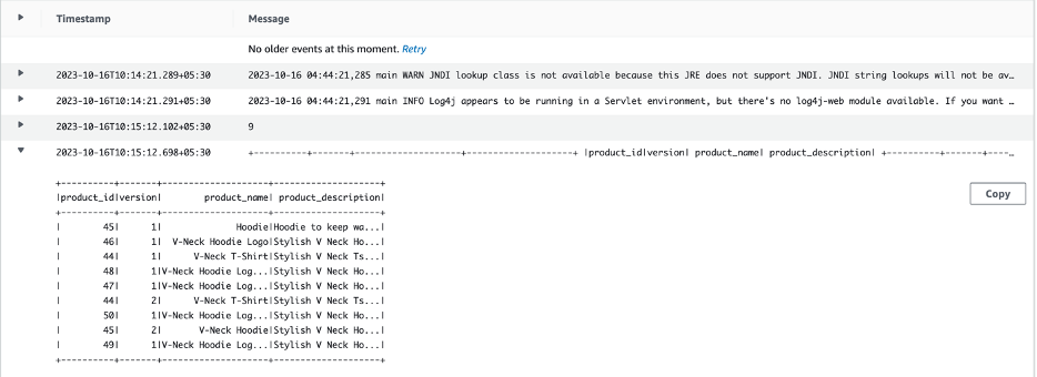 multiple_job_bookmark_keysagain after you insert the record and wait for it to succeed. - Choose the Output logs hyperlink under CloudWatch logs.