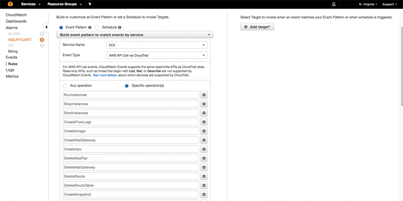 For this walkthrough, you create a CloudWatch event rule that matches specific EC2 events such as: