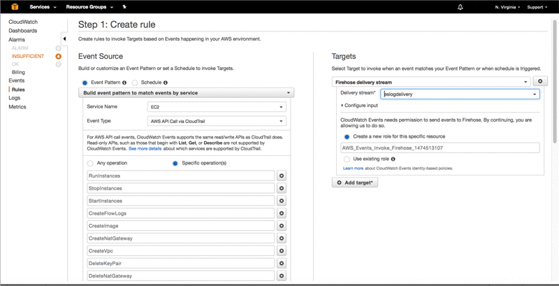 In this post, I show you how to build a near real-time API monitoring solution for EC2 events using Amazon CloudWatch Events and Amazon Kinesis Firehose. Please be sure to have Amazon CloudTrail enabled in your account.