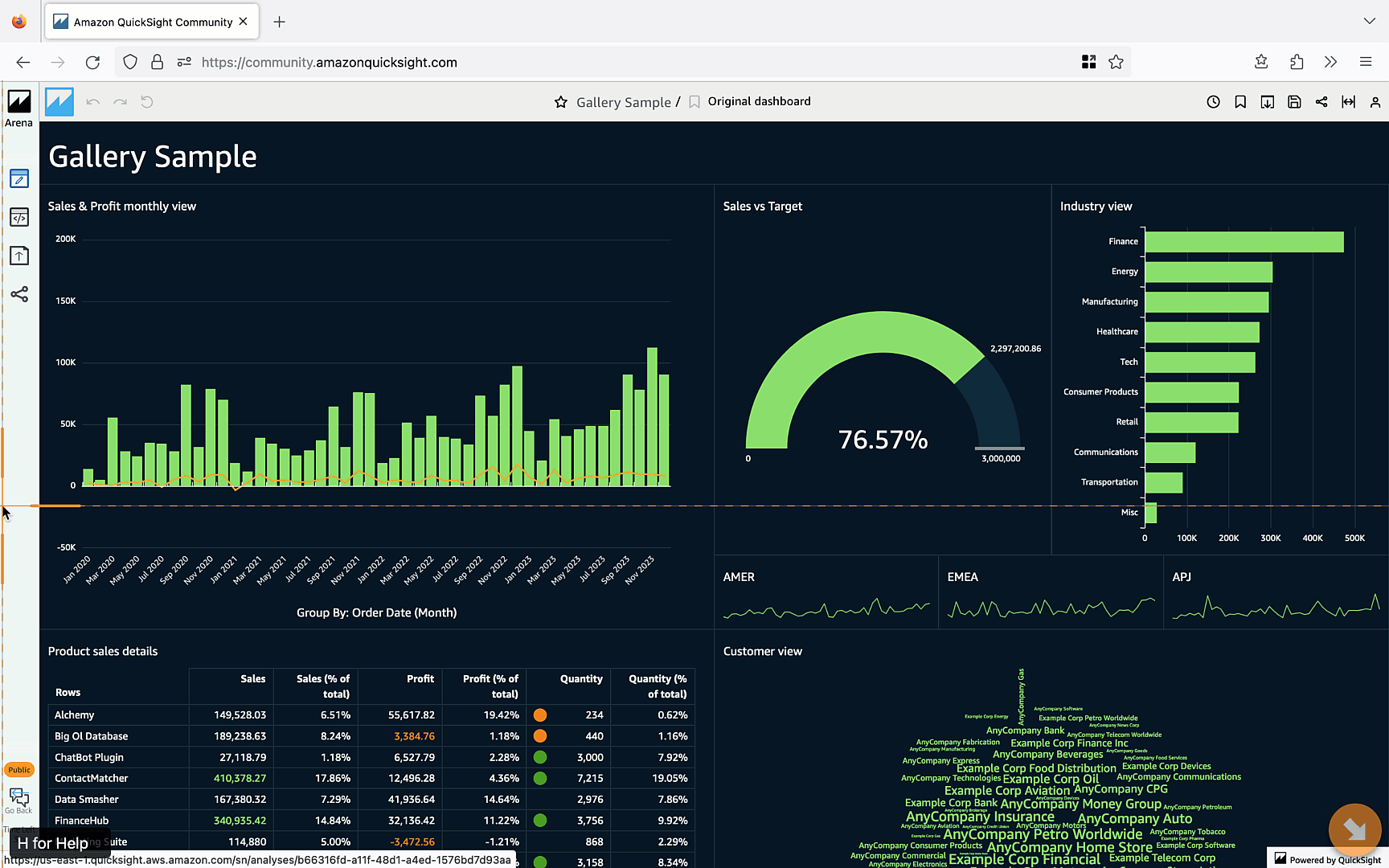 Click on an Arena link that is included in a QuickSight Community question to open the dashboard for you. Click on the copy icon to create a copy of the underlying analysis. After you figure out a solution, publish the dashboard and include a link to your solution dashboard in your reply. For examples of Arena links included in answers, see the following question posts, on calculated fields and percent differences, and look for “Arena: Click the link to view dashboard.”