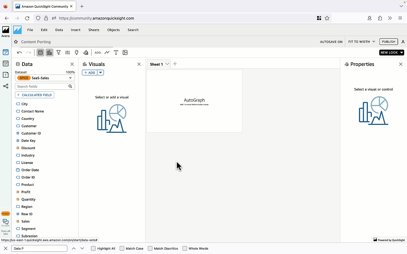 To start using QuickSight Arena, go to the QuickSight Community, and click on Arena and then Console from the top navigation bar. You will be taken through a quick tour and provided with information regarding restrictions, terms, and conditions. After you agree to the terms and conditions, you’ll be redirected to the Arena console. Arena automatically links to your QuickSight Community profile and your content persists across sessions.