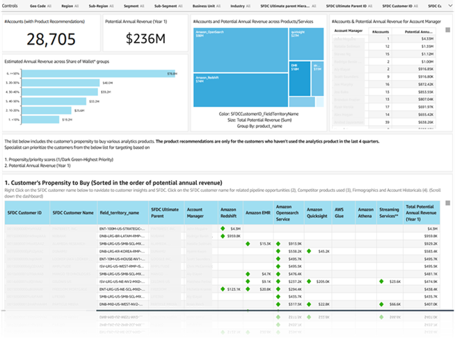We were intrigued by a recent post by Amy Laresch and Kellie Burton, AWS Analytics sales team uses QuickSight Q to save hours creating monthly business reviews. Based on what we learned from that post, we also plan to test out and eventually implement Amazon QuickSight Q, a ML powered natural language capability that gives anyone in the organization the ability to ask business questions in natural language and receive accurate answers with relevant visualizations. We’re also considering integrations with Amazon SageMaker and Amazon Honeycode-built apps for write back.