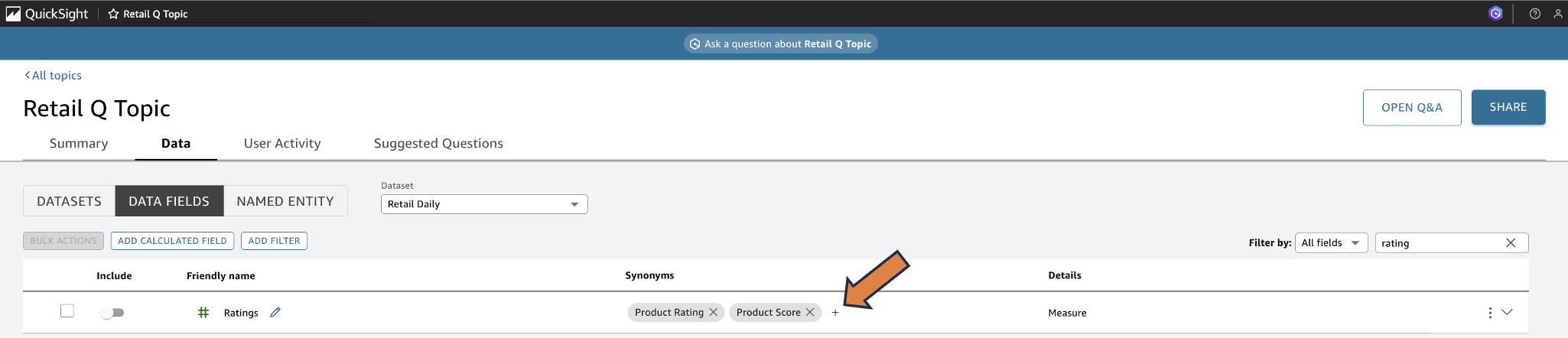 For example, if your data field is labeled Ratings but some business users might use the term “product rating” or “product score,” adding Product Rating and Product Score as synonyms makes sure Amazon Q understands and correctly interprets these variations.