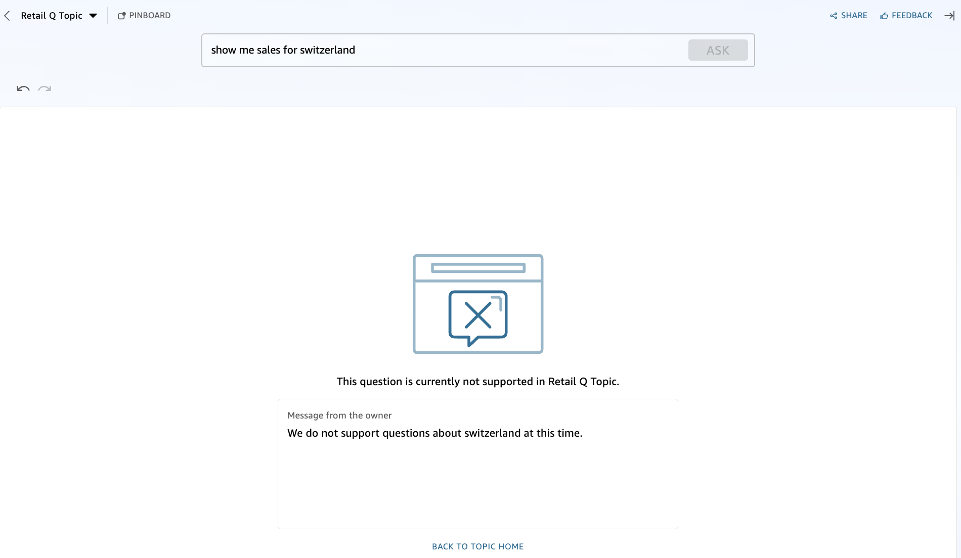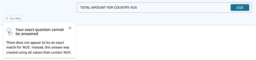 Consider a scenario where your dataset contains Australia in the country column. Without value synonyms, when a user queries “Total Amount for Country Aus,” the system fails to recognize “Aus” as equivalent to “Australia,” resulting in the following message.