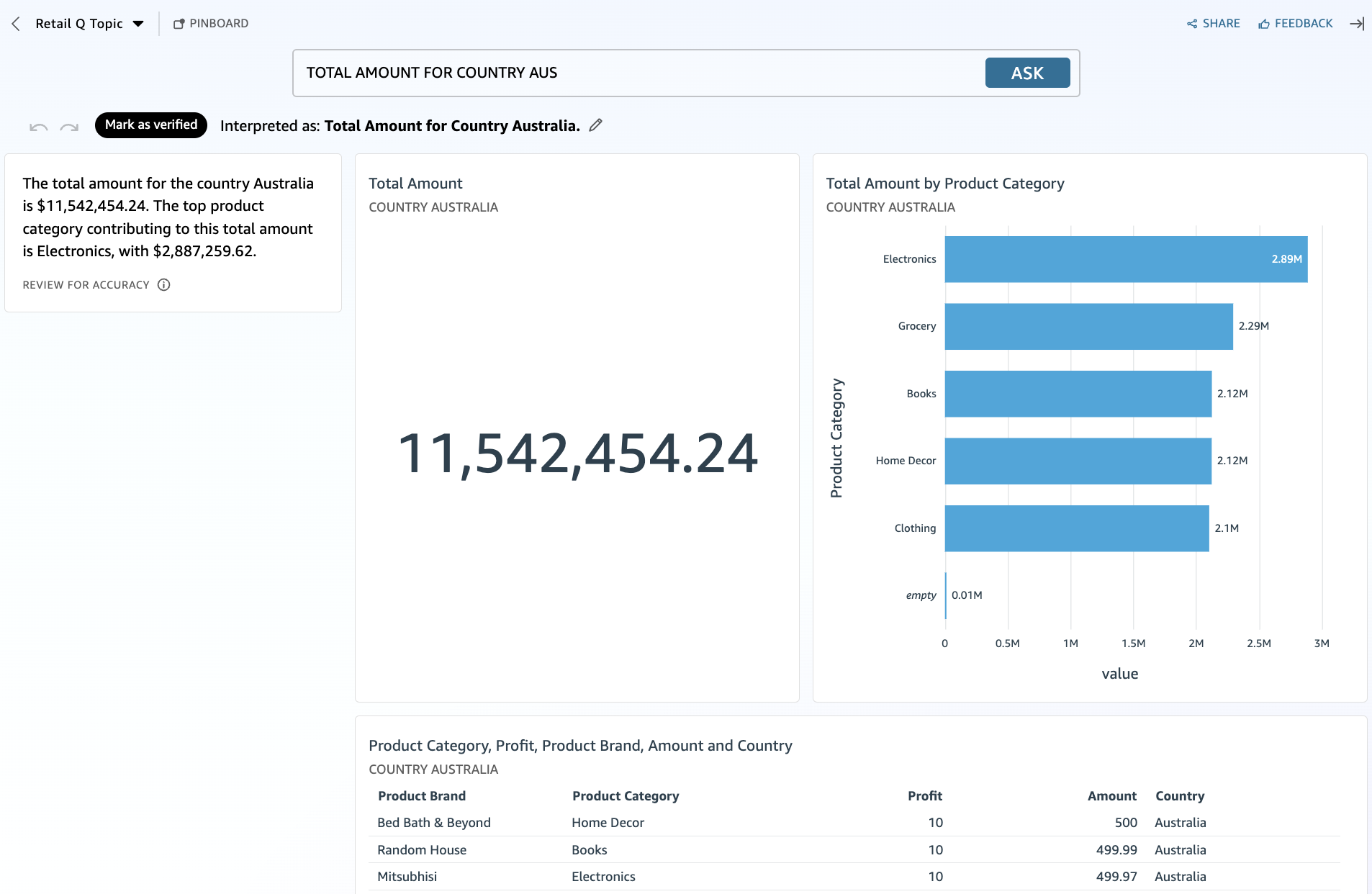 After you implement value synonyms, queries such as “Total Amount for Country Aus” will successfully retrieve data for Australia, delivering accurate insights and providing a seamless user experience.