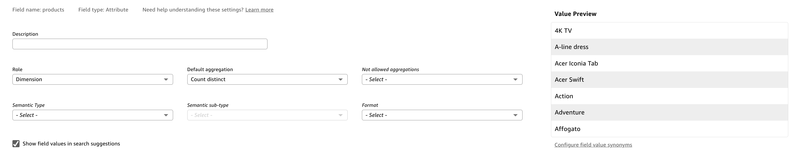 - Choose Configure field value synonyms.