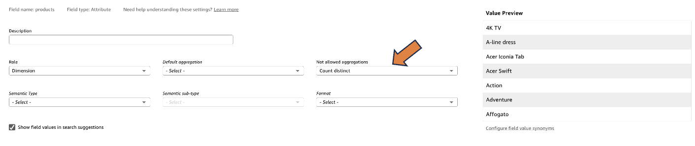Consider a business scenario where unique product counts need to be restricted for the product field. Configuring count distinct as a disallowed aggregation protects your analytics integrity by preventing unexpected unique counts.