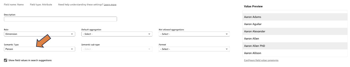 To better handle people-related queries, we demonstrate setting the semantic type of the Name field to Person. Complete the following steps: