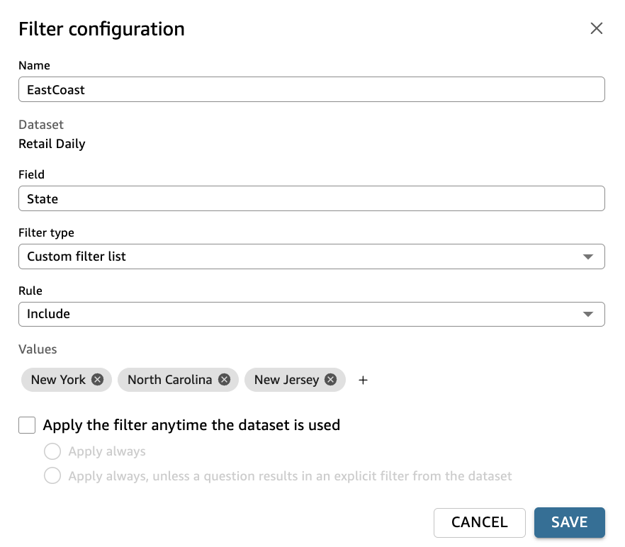 EastCoast). - For Field, choose the field to which you want to apply the filter. (In our example, we apply it to State).