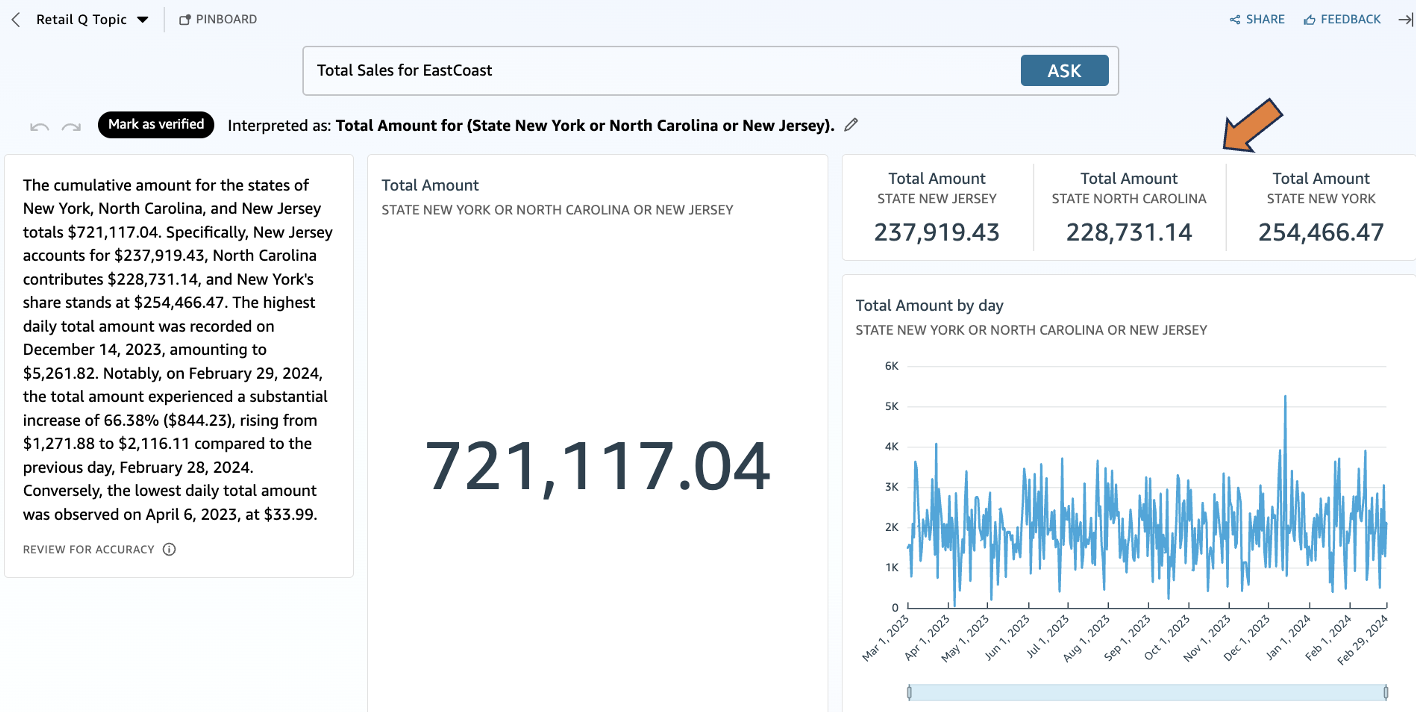 After the EastCoast filter is configured, users can query Amazon Q for “Total Sales for EastCoast” and receive accurate data for the states you added.