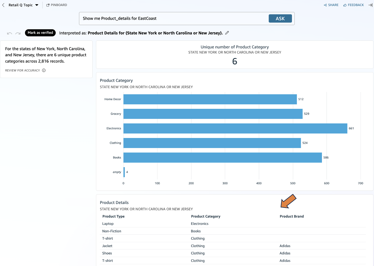 With named entities now configured, users can efficiently retrieve consolidated product information. When querying “Show me Product_details for EastCoast,” the system intelligently presents data from all associated fields, demonstrating how named entities transform complex data relationships into accessible insights.