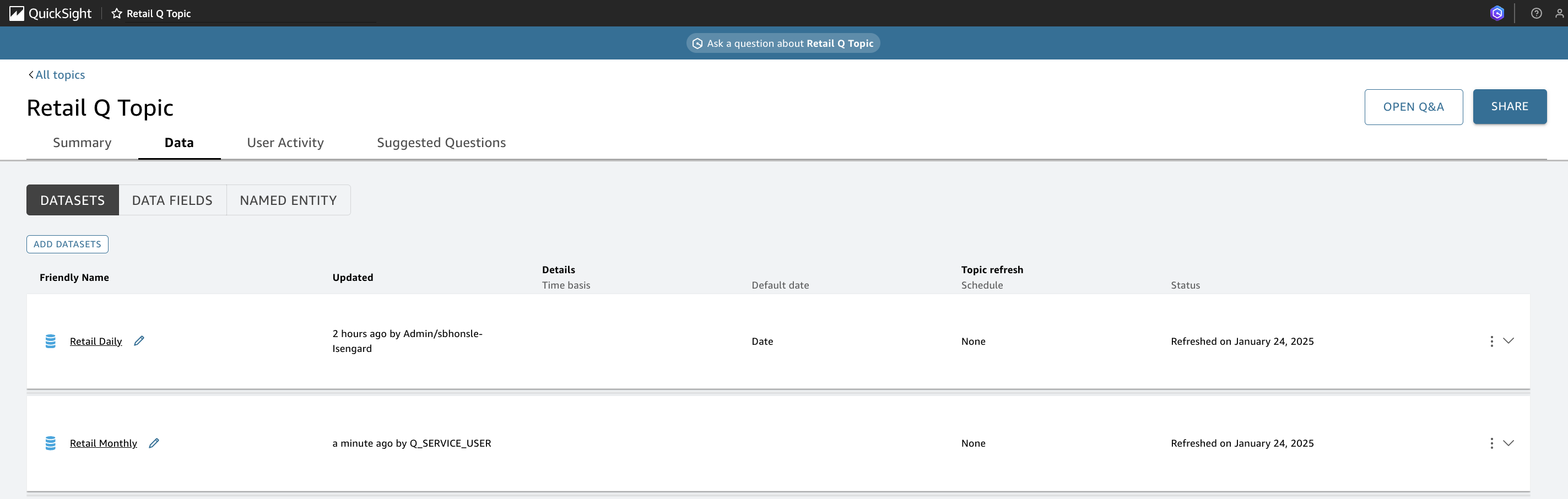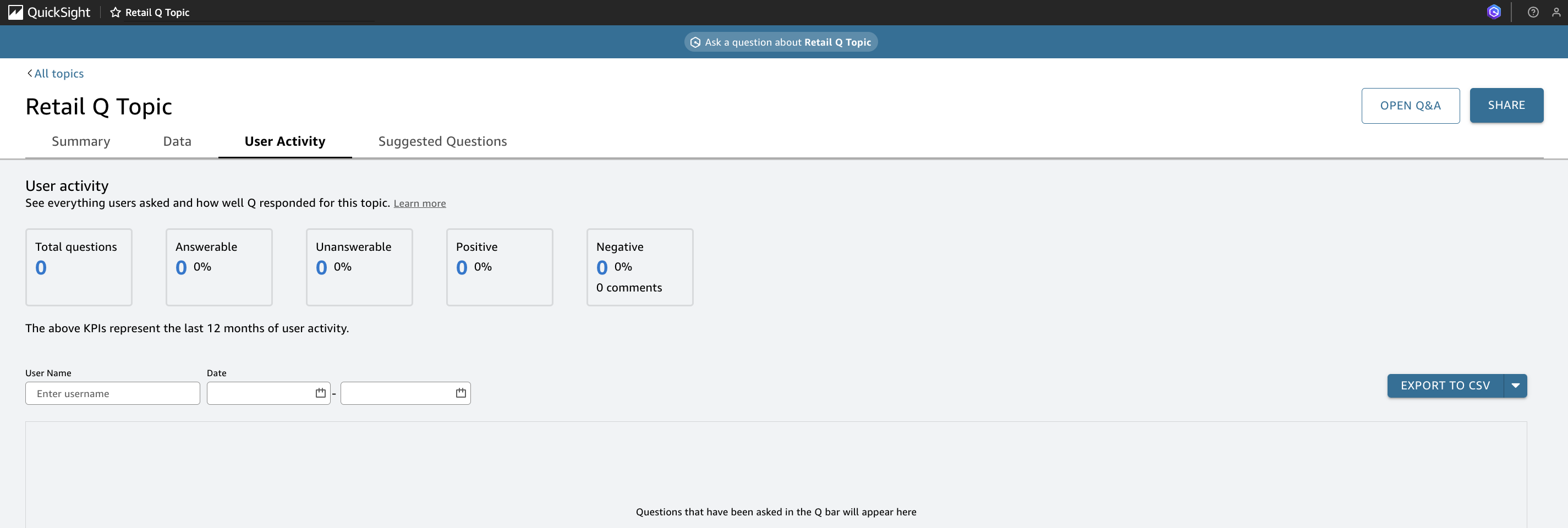 This post explored strategic approaches to enhance Amazon Q in QuickSight topics, demonstrating how effective topic curation can transform your organization’s data analytics experience. Through careful topic organization, strategic keyword definition, and customized responses, businesses can empower users to access precise insights using natural language queries. The built-in user activity tracking capabilities provide administrators with valuable metrics to continuously optimize content based on actual usage patterns and feedback. This systematic approach leads to improved answer accuracy and more efficient data-driven decision-making across your organization.