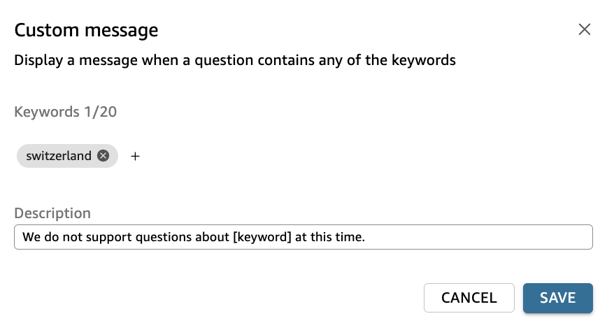 switzerlandas the keyword.) - For Description, enter the custom message that users will see when they ask questions that include the keywords you’ve defined for this topic.