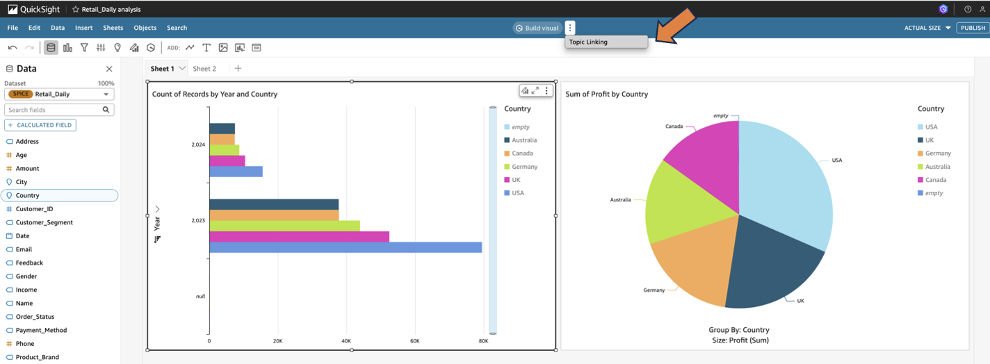 - On the QuickSight console, navigate to the analyses where you want to link an Amazon Q topic.