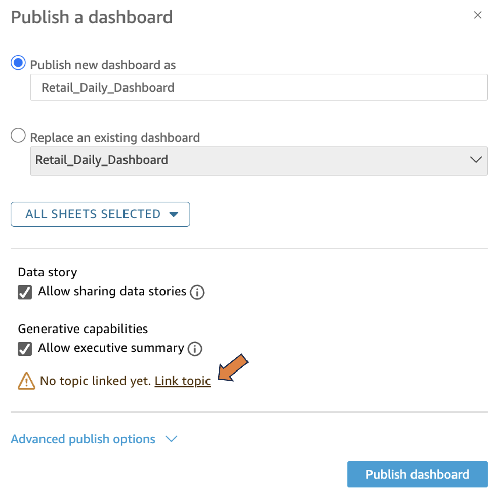 Complete the following to link an Amazon Q topic to a dashboard: