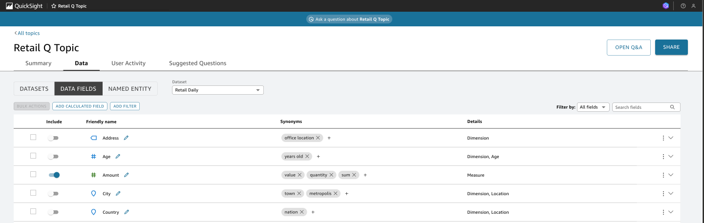- Data fields – Provides comprehensive details about all the data fields along with synonyms. Amazon Q automatically includes the most relevant columns and adds field name synonyms in this initial version of the topic.